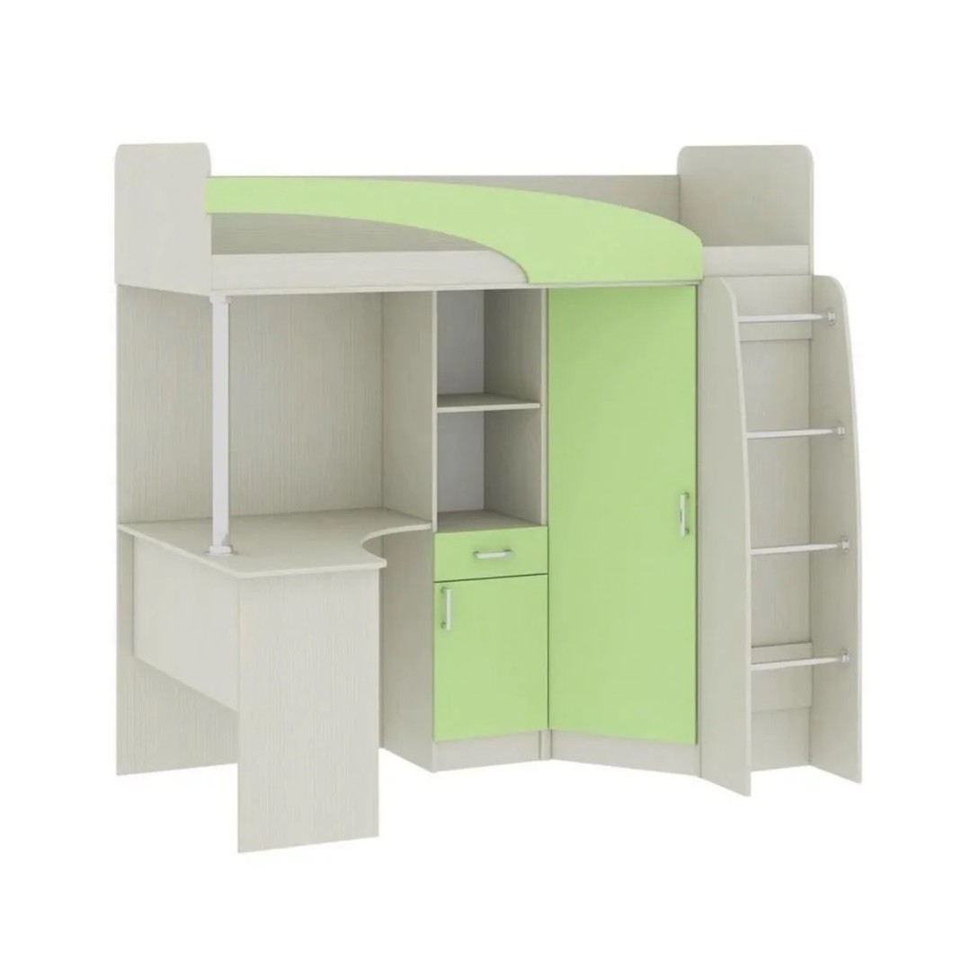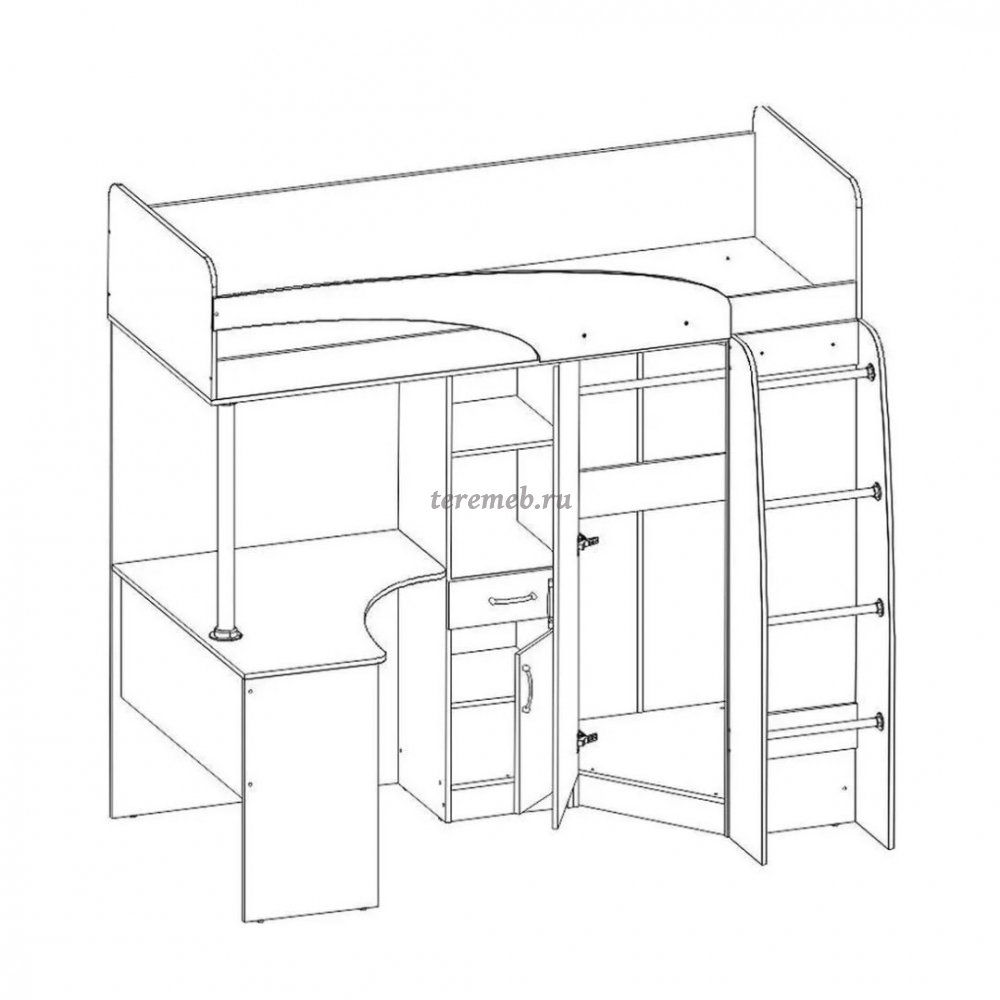Описание: Кровать-чердак "Карамель 77-01" это отличное решение проблемы нехватки свободного места в детской комнате. На небольшом пространстве умещается кровать с полноценным спальным местом, большой угловой рабочий стол, стеллаж для письменных принадлежностей и игрушек и большой угловой шкаф для одежды.
