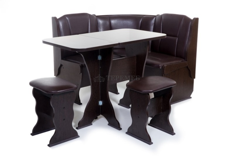 Удобное мягкое сиденье и спинка дивана и табуретов с наполнителем ППУ обиты современной экокожей, отличающийся повышенной прочностью и долговечностью.