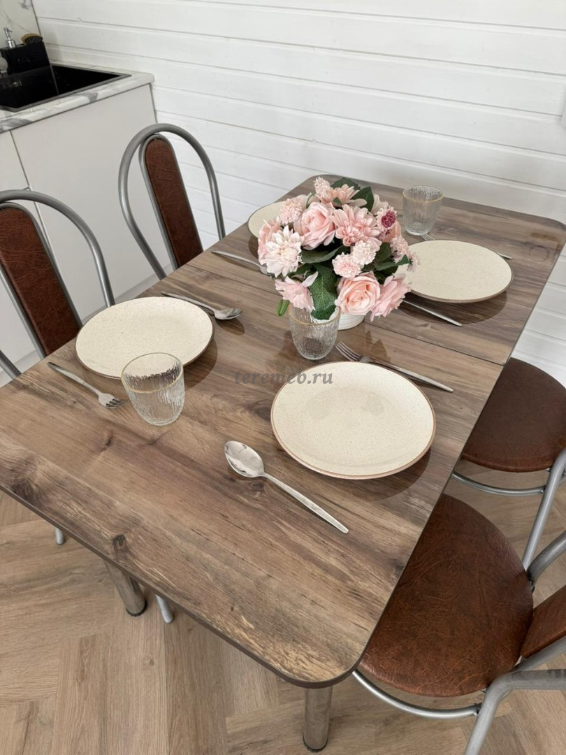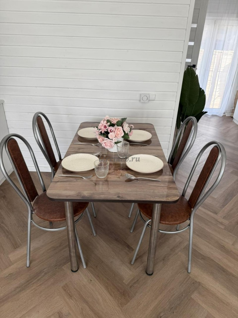Столешница обеденного стола имеет прямоугольную форму со скруглениями по углам.