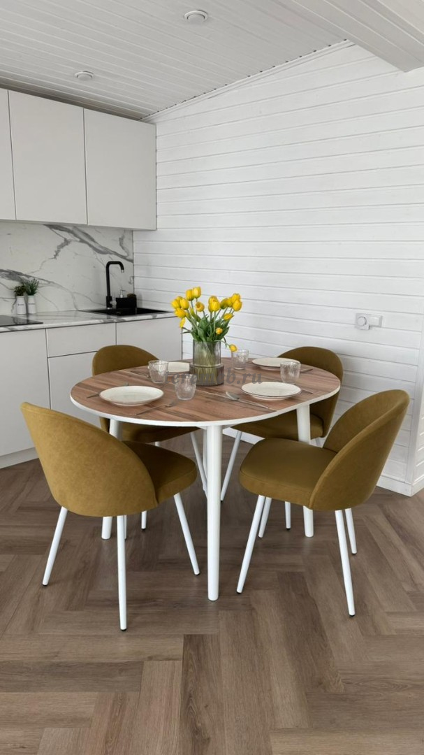 Царга и ножки стола изготовлены из натурального дерева покрытым в цвет "белый".