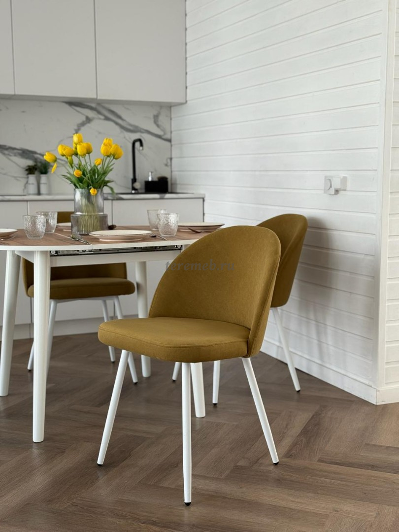 Сиденье и спинка стула мягкие с наполнителем из пенополиуретана стандартной плотности и обтянуты высококачественным износостойкой тканью велюр "Мадера №38" (горчичный), что делает данную модель надёжной и неприхотливой в эксплуатации.
