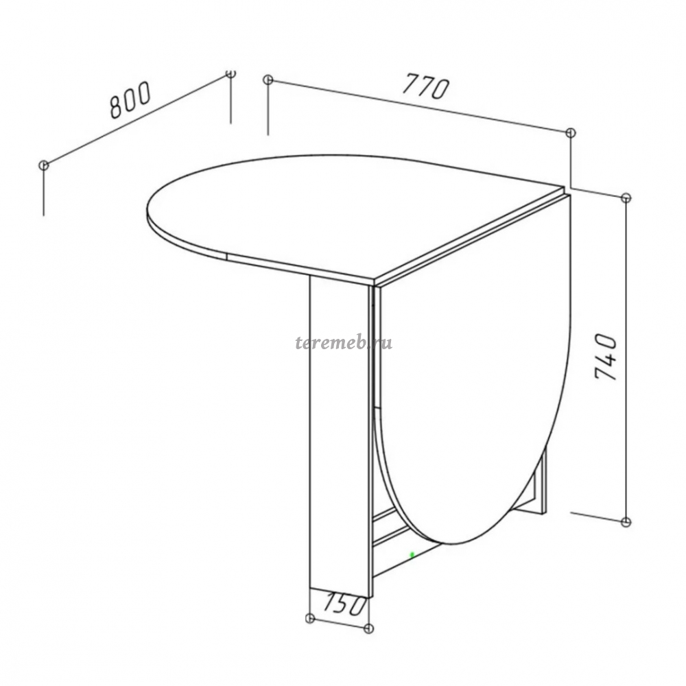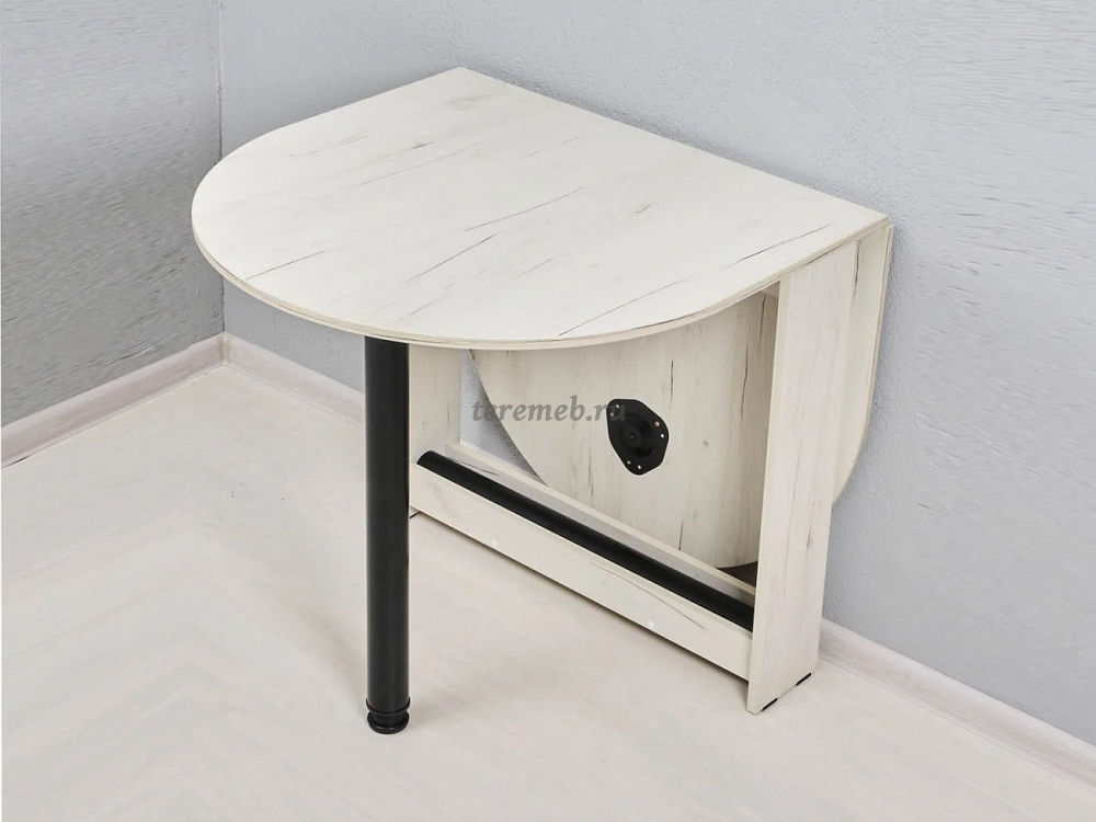 Сложение только одного крыла, под которым находится фиксатор выдвижной части. При этом опора хранится в специальной нише в основании стола.