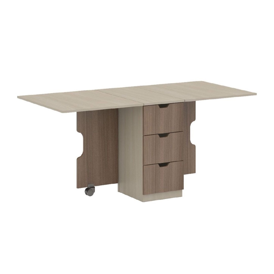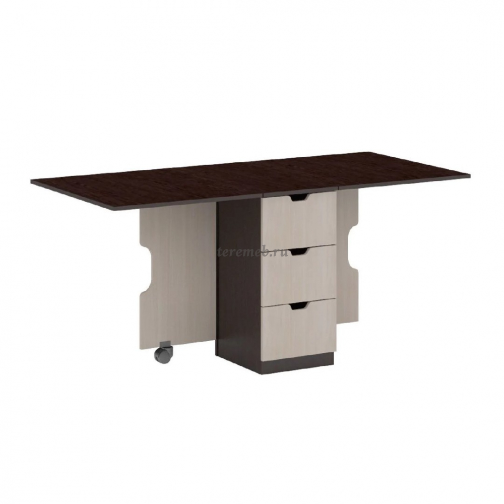 Описание: Преимуществом стола-книжки "СТ-01" является наличие в средней части вместительных ящиков и открытых полок. В сложенном состоянии стол займёт совсем не много места и не будет выполнять функцию комода или тумбы.
