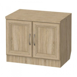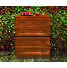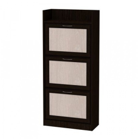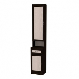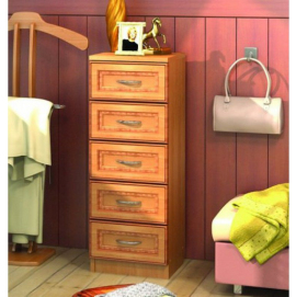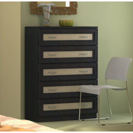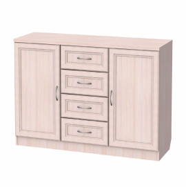 Изготовлена из ламинированной ДСП толщиной 16 мм. Фасады дверей и ящиков отделаны рамкой МДФ. Изящная металлическая фурнитура удачно гармонирует с фасадами и завершает дизайн изделия.