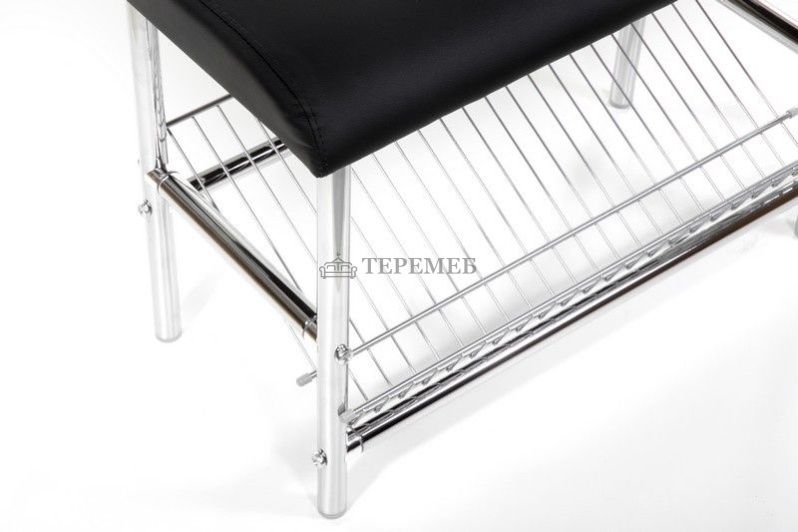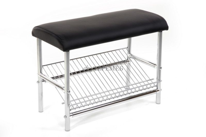 Полка под обувь изготовлена из хромированной металлической трубы, установлена под небольшим наклоном и имеет бортик.