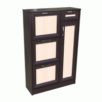 Тумба оборудована тремя откидными секциями под обувь, рассчитанных на 12 пар обуви, одним выдвижным ящиком для мелочей на роликовых направляющих и секцией с распашной дверью, за которой установлены две съемные полки.