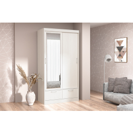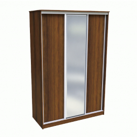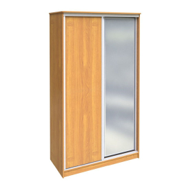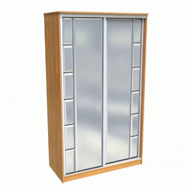 Слева и справа за дверями-купе с зеркалами симметричные отделения с двумя верхними антресольными полками, под ними металлическая горизонтальная штанга.