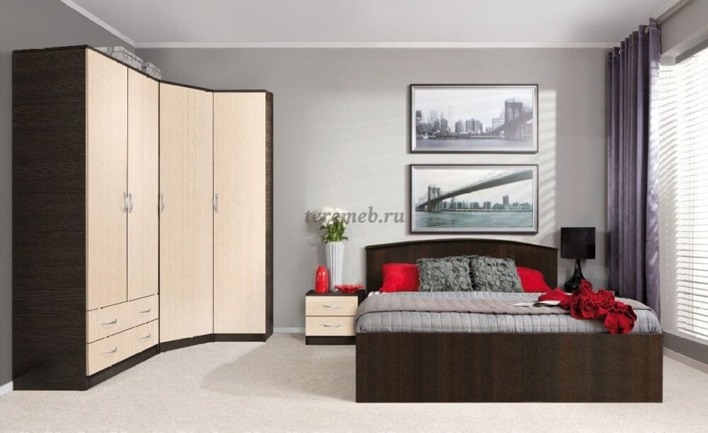 - угловой. Такая мебель является идеальным решением для спальных комнат с небольшими квадратами;